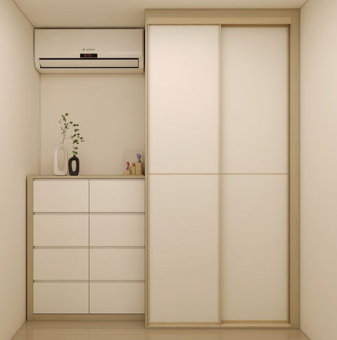 本案以 日系奶油感 為基底,透過暖白櫃體、淺木色細節與俐落線條,營造出清爽柔和、同時富有生活溫度的空間氛圍。整體設計減少繁複裝飾,回歸櫃體比例與機能配置本身,讓空間在輕盈簡潔之中,維持更高的實用性與整齊感。