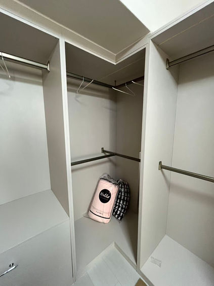 本案以 義式極簡 為主軸,透過暖白櫃體、深咖木色、灰玻與燈光層次的搭配,勾勒出沉穩、俐落且富有質感的空間表情。整體設計著重於立面完整度與材質比例的平衡,讓收納不只是機能配置,更成為空間風格的一部分,在簡潔之中展現更成熟的都會感。